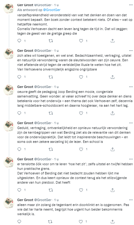 *De vijfde is een “flitsrecensie” – en een heel mooie! – op Twitter door filosoof Gert Groot, op 23 augustus 2022. Je kunt printjes ervan hier lezen: