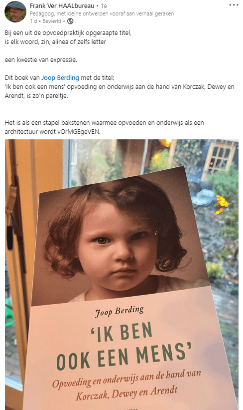*NIVOZ/Het kind herplaatste op 17 augustus 2023 op verschillende social media een essay van mij, van 16 december 2015, waarin ik al preludeerde op het boek. Je kunt het hier lezen: https://nivoz.nl/nl/nro/ik-ben-ook-een-mens-vijf-pedagogische-kernbegrippen. Toevallig kwam mij op dezelfde dag een stuk van 30 mei 2023 onder ogen uit Profielen, het blad van Hogeschool Rotterdam, waarin docent en trainer Erfan Pourmohammadi naar mijn boek verwijst – en mij en passant “voormalig huispedagoog” noemt. Je kunt het hier lezen: https://profielen.hr.nl/2023/hr-docent-en-inclusiviteits-trainer-pourmohammadi-inclusiviteit-is-liefde-hoe-kan-dat-je-nou-irriteren/